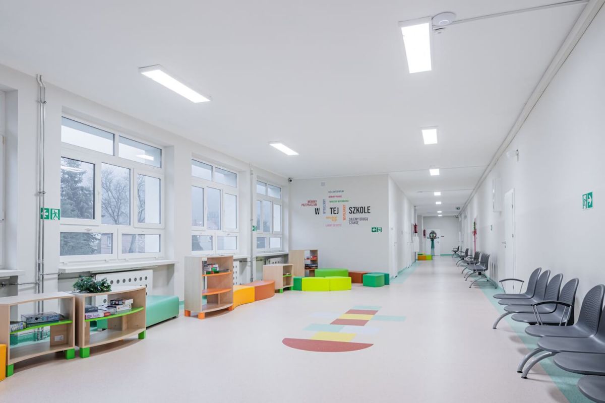 Nowoczesna przestrzeń edukacyjna zaczyna się od dobrego światła. Zespół szkolno-przedszkolny w Bardzie to przykład miejsca, które po trudnym czasie zyskało funkcjonalne i przyjazne wnętrza, sprzyjające nauce, ruchowi i codziennym aktywnościom dzieci. Dostarczone przez nas energooszczędne oświetlenie objęło sale lekcyjne i gimnastyczne, korytarze oraz przestrzenie wspólne. Zastosowaliśmy inteligentne oprawy SQ 1200 LED IoT, lampy Dione LED z czujnikami ruchu które zapewniają równomierne, bezpieczne dla wzroku światło – dokładnie tam, gdzie jest potrzebne.