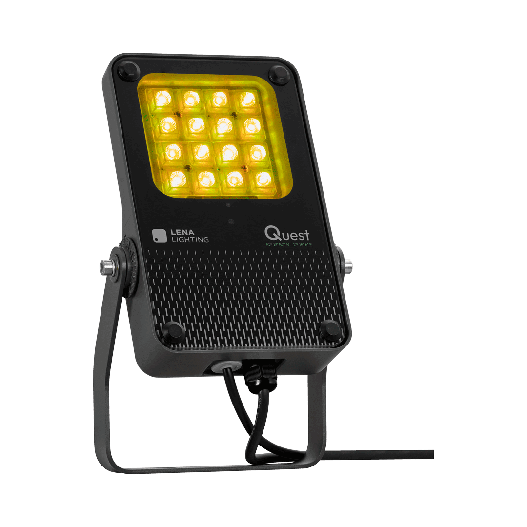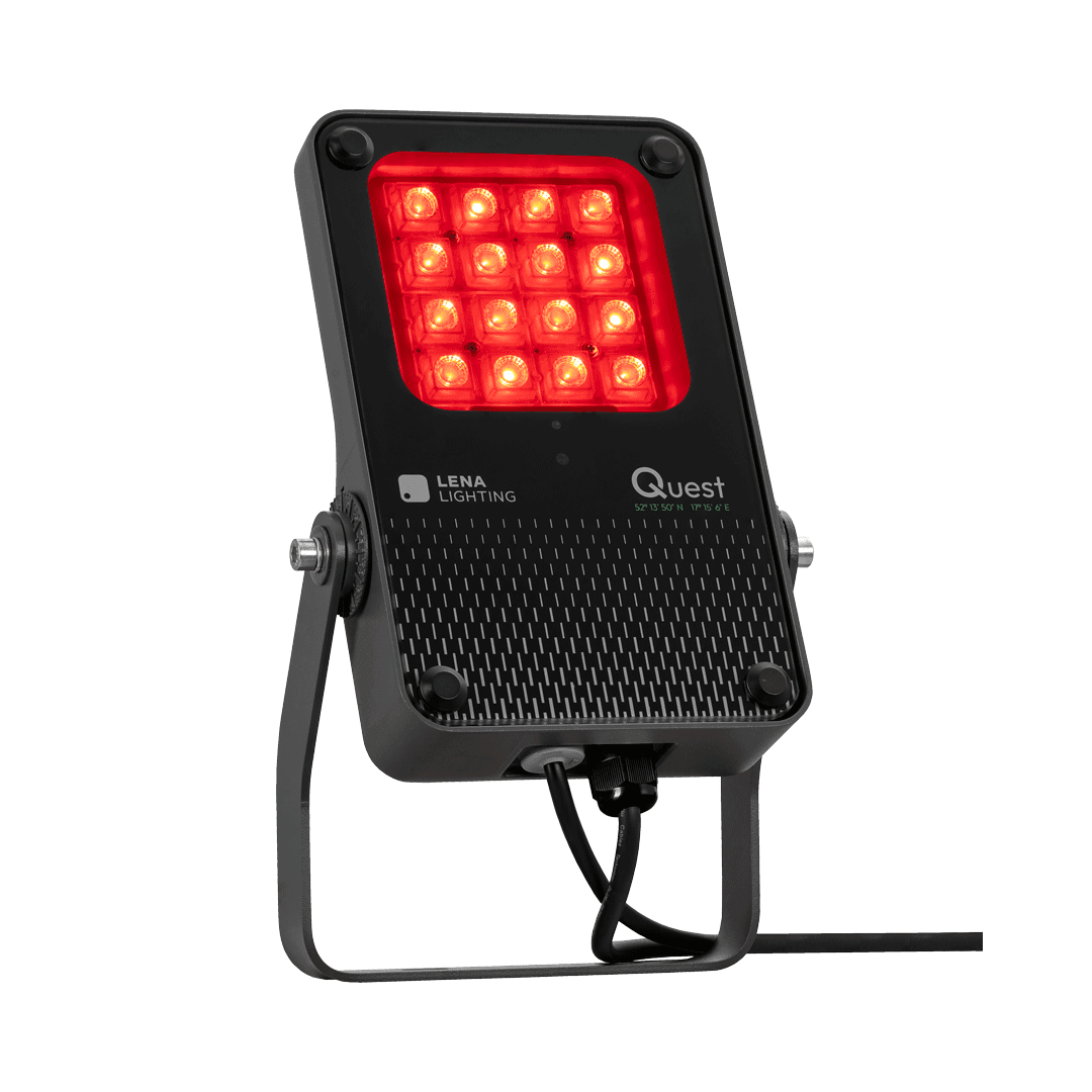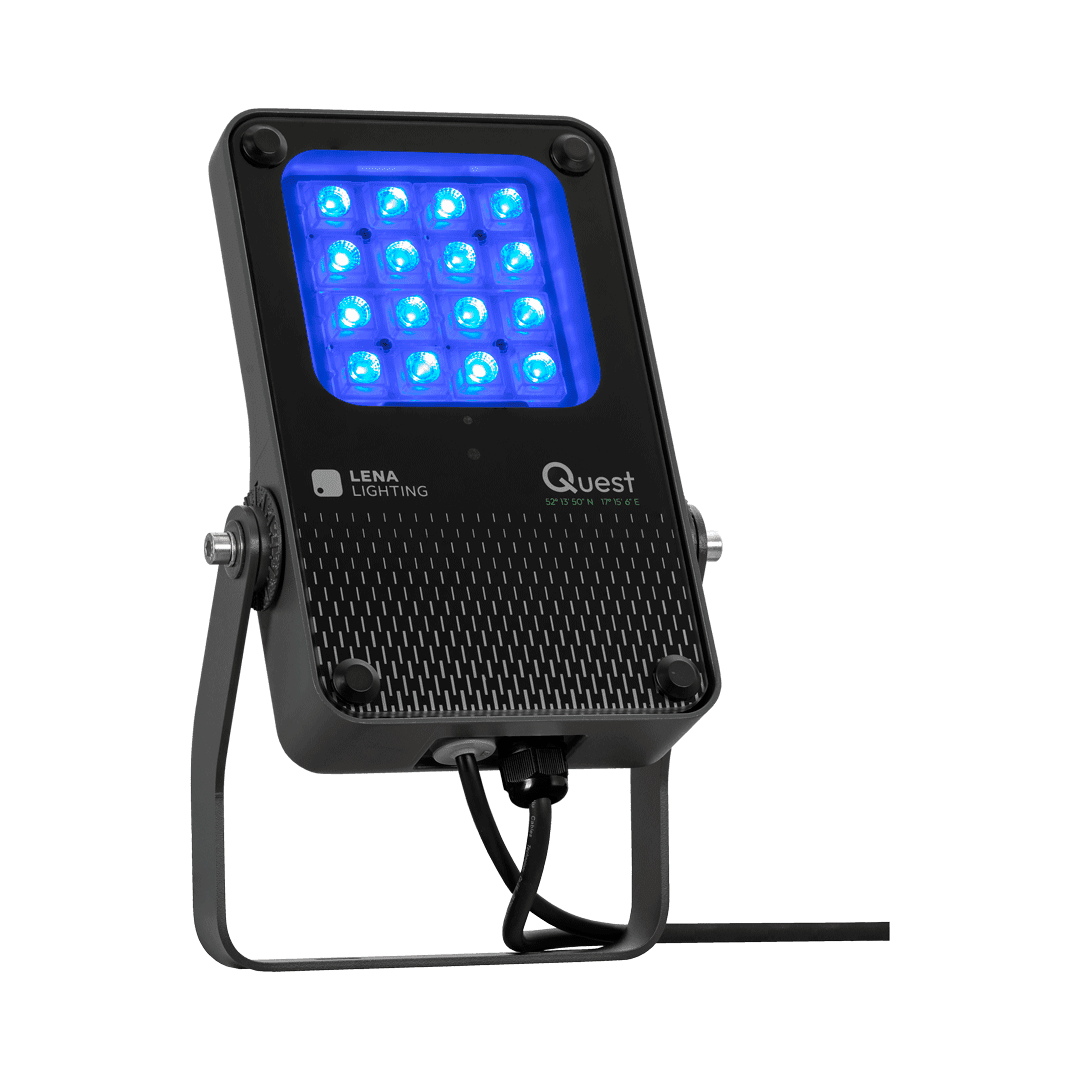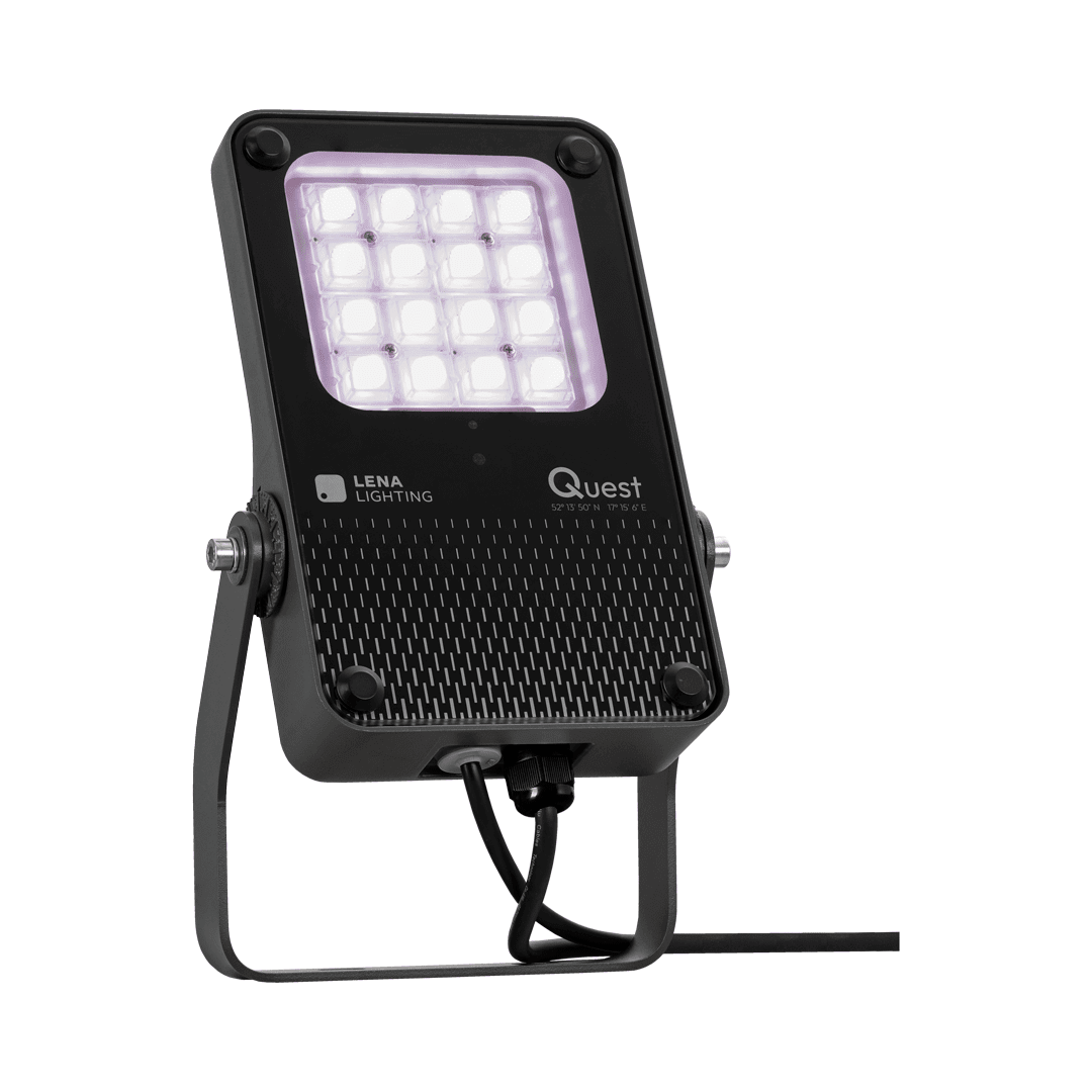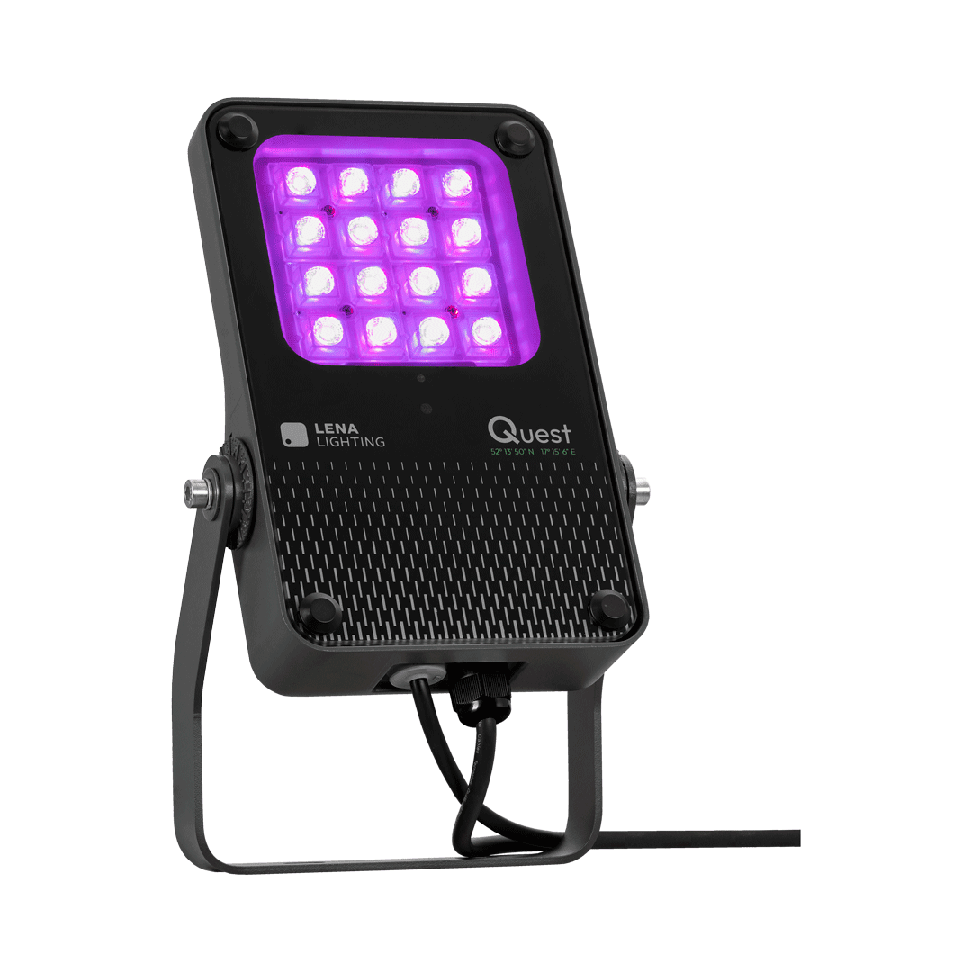 Quest LED Evo XS RGBW to kompaktowe, a zarazem niezwykle wydajne naświetlacze klasy premium, produkowane w Polsce. Korpus wykonano z ciśnieniowego odlewu aluminium w klasie korozyjności C5, malowanego proszkowo. Brak zewnętrznego radiatora i żeber ułatwia utrzymanie oprawy w czystości. Hartowana szyba chroni wysokowydajne diody LED a szeroki wybór optyk pozwala idealnie dopasować strumień światła do potrzeb projektu. Zastosowanie technologii RGBW umożliwia precyzyjne odwzorowanie pełnej palety barw wraz z naturalną bielą, zapewniając najwyższą jakość efektów iluminacyjnych w zastosowaniach architektonicznych i dekoracyjnych.