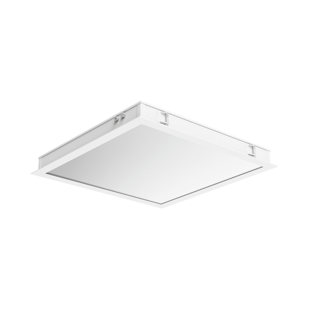 Front oprawy wykonany jest z aluminium oraz hartowanego szkła o grubości 4 mm, odpornego na uderzenia (klasa IK09) oraz działanie środków chemicznych. System modułowych przesłon (Glass / Opal / PRM) pozwala na dobór odpowiedniej charakterystyki optycznej w zależności od wymagań aplikacji — od jednolitego, rozproszonego światła po precyzyjne rozsyły kierunkowe. Wersja SW R przeznaczona do montażu w sufitach wzmocnionych.