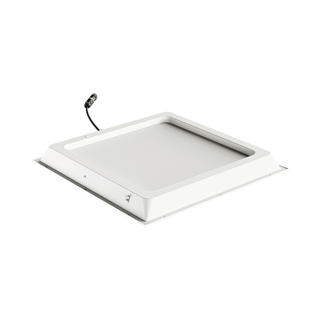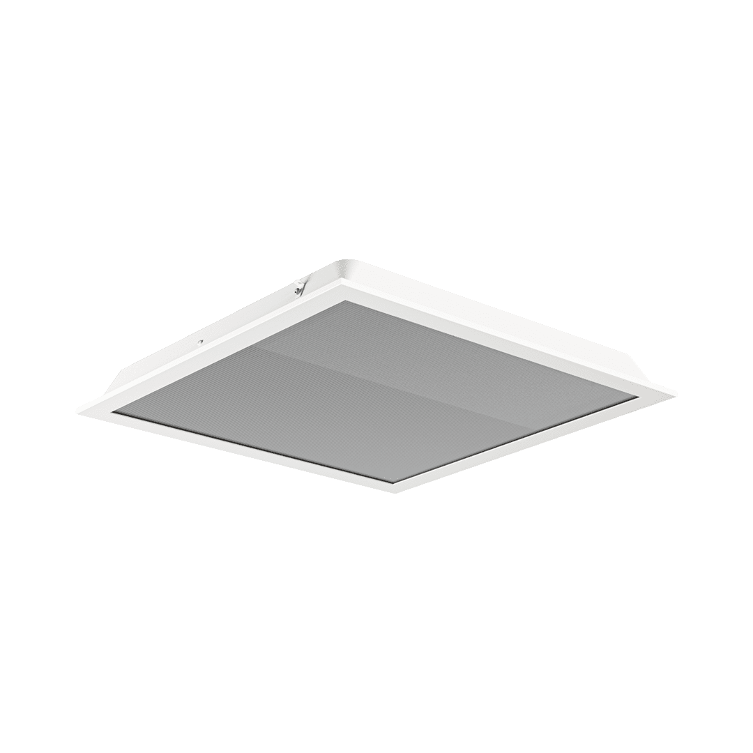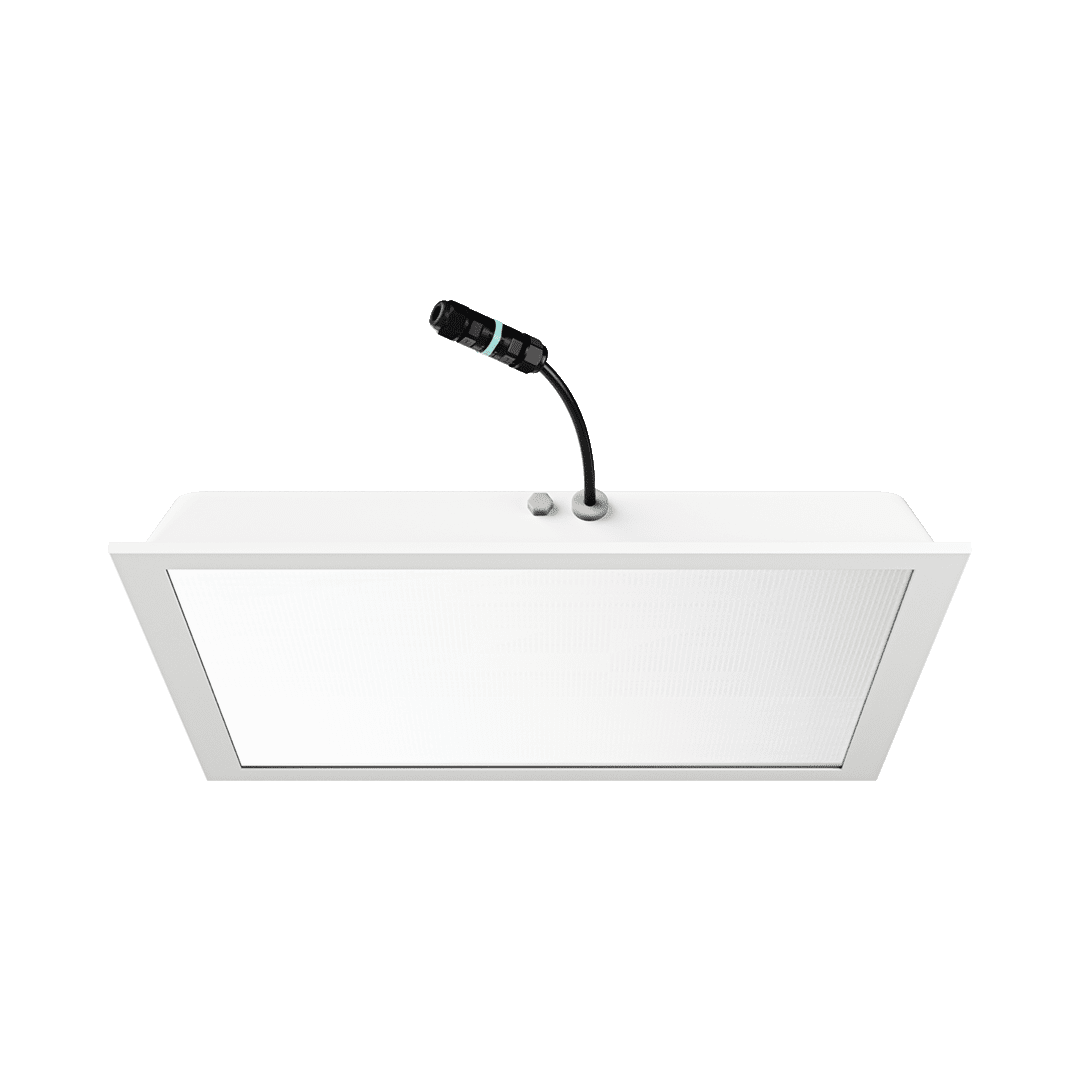 Front oprawy wykonany jest z aluminium oraz hartowanego szkła o grubości 4 mm, odpornego na uderzenia (klasa IK09) oraz działanie środków chemicznych. System modułowych przesłon (Glass / Opal / PRM) pozwala na dobór odpowiedniej charakterystyki optycznej w zależności od wymagań aplikacji — od jednolitego, rozproszonego światła po precyzyjne rozsyły kierunkowe. Wersja SM przeznaczona do montażu w sufitach modułowych.